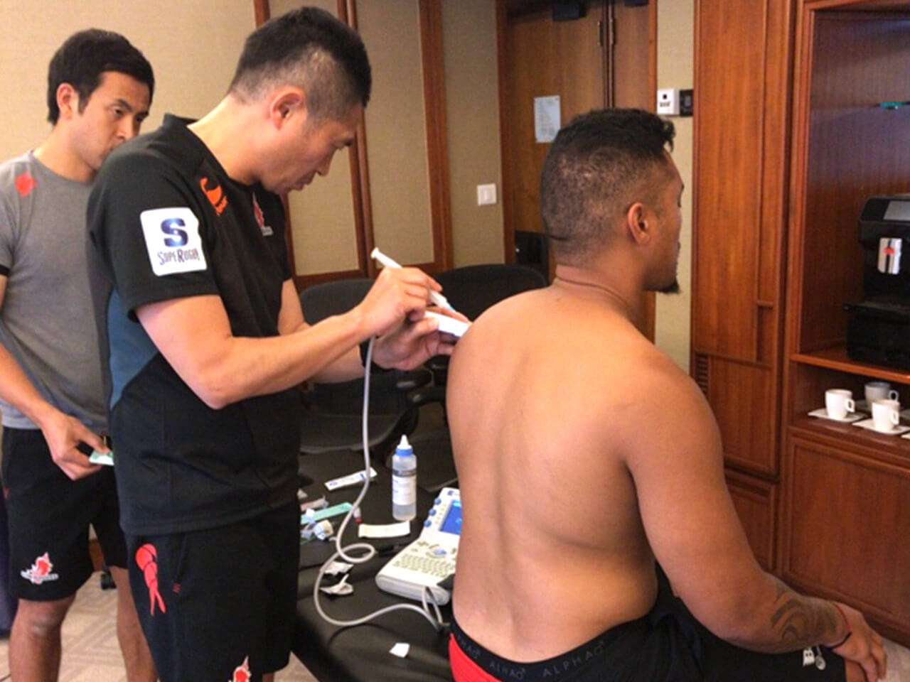 この他には2016年と17年の2年間はスーパーラグビー サンウルブズのチームドクターを、2018年からは7人制ラグビー日本代表のチームドクターをさせて頂いています。代表クラスのチームと高校、大学で大きく違うのは海外遠征です。サンウルブズでは南アフリカに3回、オーストラリア2回、シンガポールへは忘れるくらい帯同しました。7人制ではアメリカやカナダ、韓国などいろいろな国に帯同させて頂いていますし、東京オリンピックのサポートもすることになっています。遠征時は気軽に病院受診ができませんので、受傷機転を考え、正確に理学所見をとること、エコーを駆使することがとても大切となります。トップ選手を各チームから預かって代表チームは結成されていますので、いい加減な判断はできませんし、治療方針の決定やチームへの報告には神経をすり減らされます。また遠征前には時差ぼけ解消や現地での感染症についての情報など普通では考えなくても良いようなことまで準備しておかなくてはなりません。昨年にいたってはCOVID-19について選手たちに講義をしなければならず、必死に勉強しました。楽しいというよりも大変なことが多いですが、テレビでしか見られないような選手、コーチ達と普通に会話したり、食事を一緒にしたり、かけがえのない経験ができました。今でもどこかの試合会場で気兼ねなく声をかけてくれるなど嬉しいこともたくさんあります。